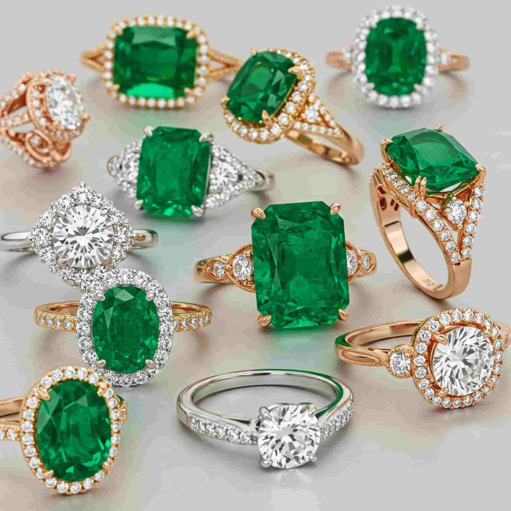 A classic combination might feature an emerald centerpiece flanked by white sapphire accents, amplifying the green’s vibrancy.