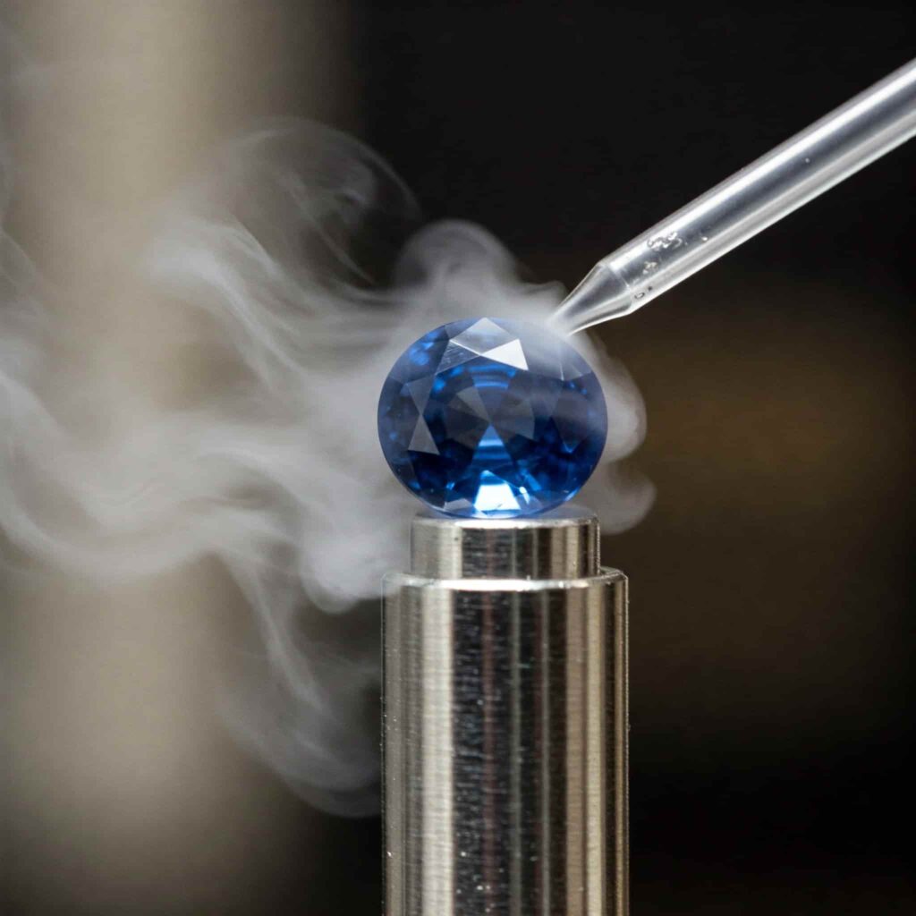 Counterfeit gems can often be identified by small imperfections within the stone. Examine the sapphire stone carefully under bright light, tilting and turning it to catch the light from all angles. Use a jeweler’s magnifying loupe to inspect the interior – if you notice any tiny air pockets or bubbles trapped inside, that’s a telltale sign that the gem is an imitation rather than a natural precious stone.