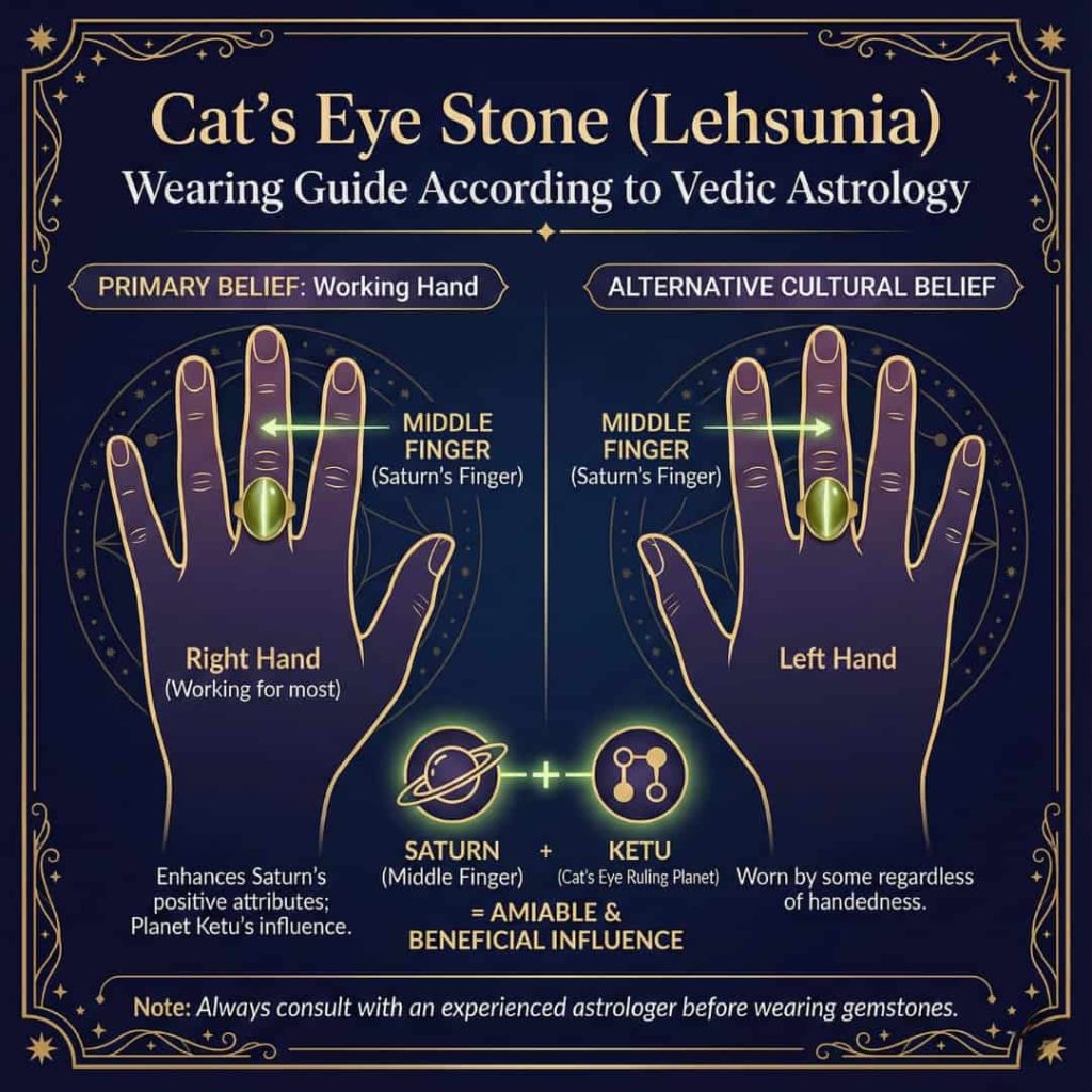 According to Vedic astrology, Cat’s eye gemstone is primarily worn in the middle finger of the working hand, which is the right hand for most right-handed individuals and the left hand for left-handed individuals. In some cultures and their belief systems, it is also worn in the middle finger of the left hand regardless of whether the person is right-handed or left-handed.