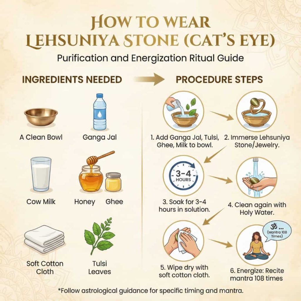 According to Vedic astrology, Wednesday is considered the most auspicious day to wear a cat’s eye (Lehsunia) stone, as it’s associated with planet Ketu.